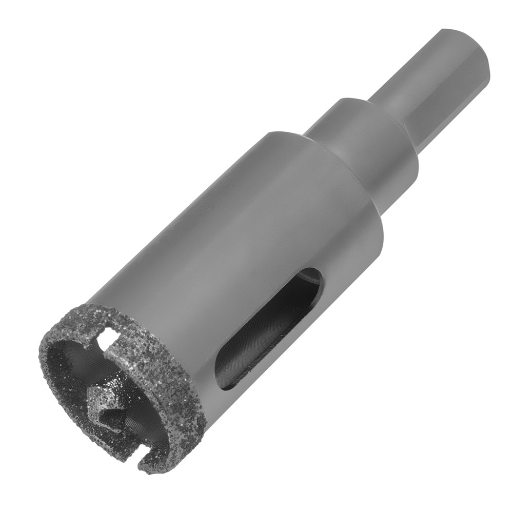 Сверло обладает высокой концентрацией алмазов в режущем слое, что обеспечивает легкость и скорость сверления керамогранита. Оно отлично подходит для использования с дрелями и шуруповертами и требует водяного охлаждения, что значительно увеличивает срок его службы.
