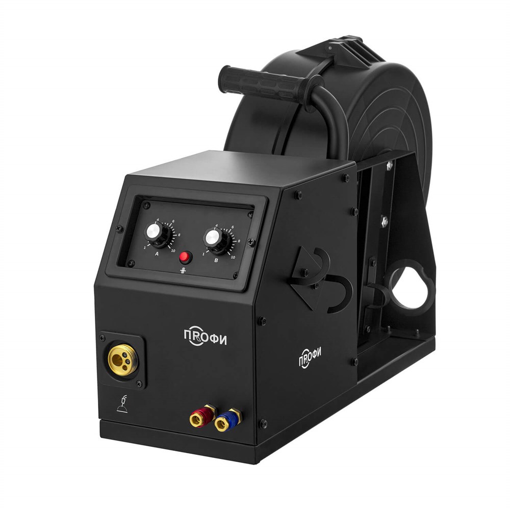 На передней панели устройства расположены регуляторы скорости подачи проволоки и сварочного напряжения, а также кнопка протяжки проволоки. Задняя панель включает в себя кронштейн для жесткой фиксации кабель-пакета и разъемы для его подключения. Боковая часть блока имеет кронштейн для крепления сварочной горелки, а ручка с резиновой накладкой обеспечивает удобство при перемещении.