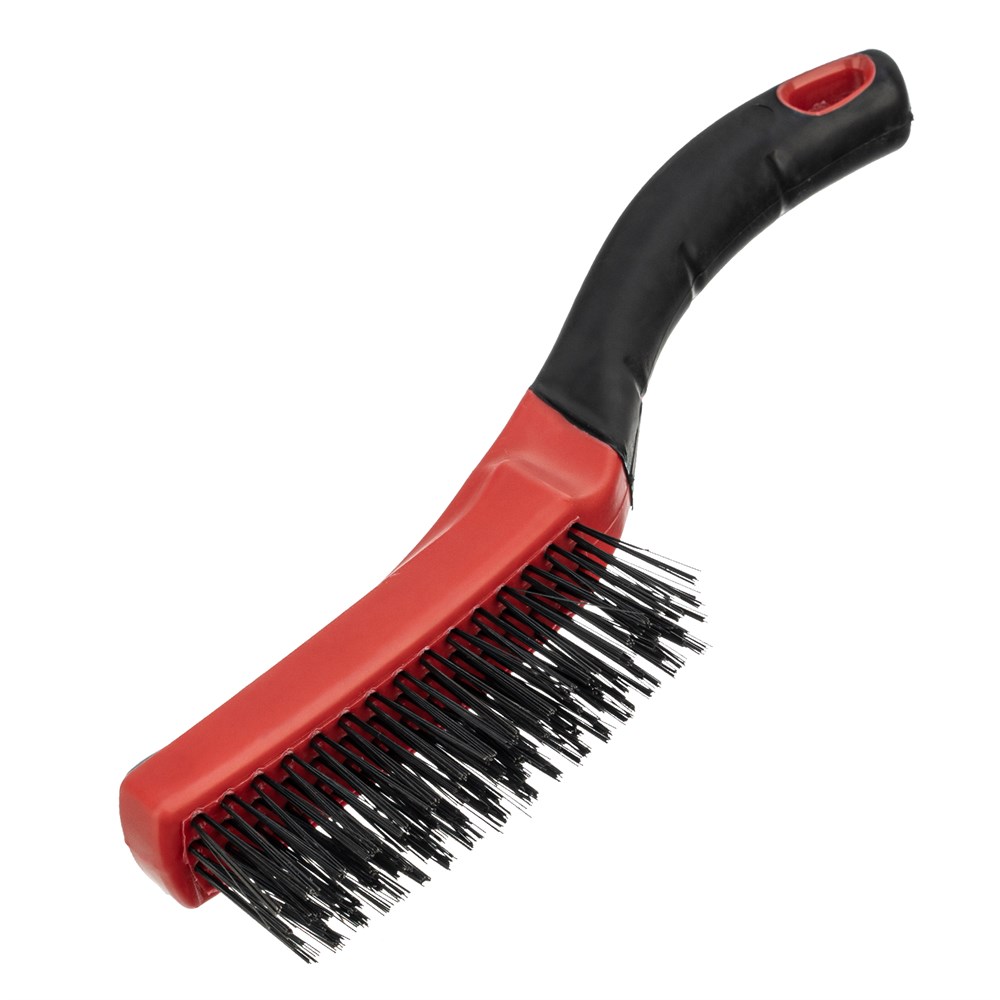 Эта щетка обладает уникальным дизайном с расположением пучков проволоки в четыре ряда, что обеспечивает высокий уровень производительности при работе. Изогнутая рукоятка, покрытая эргономичным материалом, гарантирует надежный хват, что особенно важно при длительном использовании.