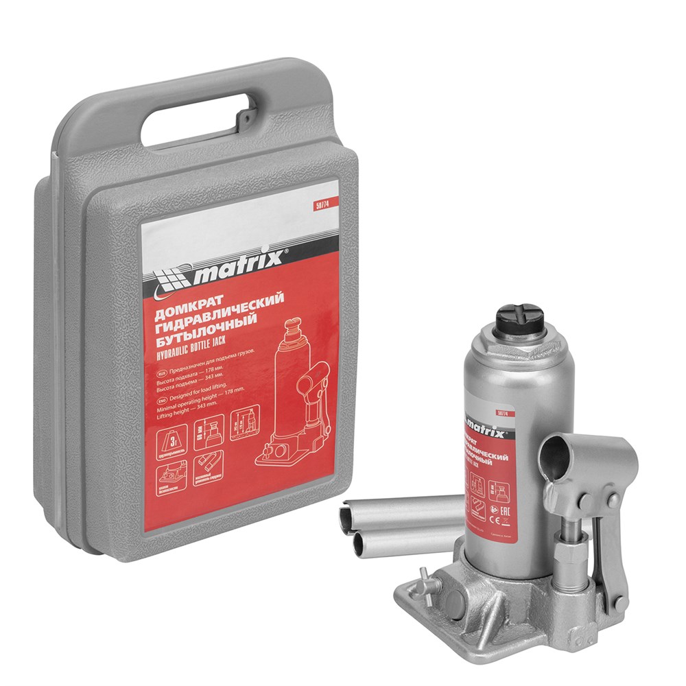 Домкрат гидравлический бутылочный, 3 т, h подъема 178-343 мм, в пластиковом кейсе Matrix