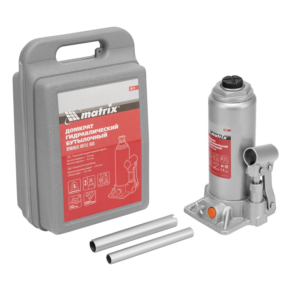 Домкрат гидравлический бутылочный, 6 т, h подъема 216-413 мм, в пластиковом кейсе Matrix 50777