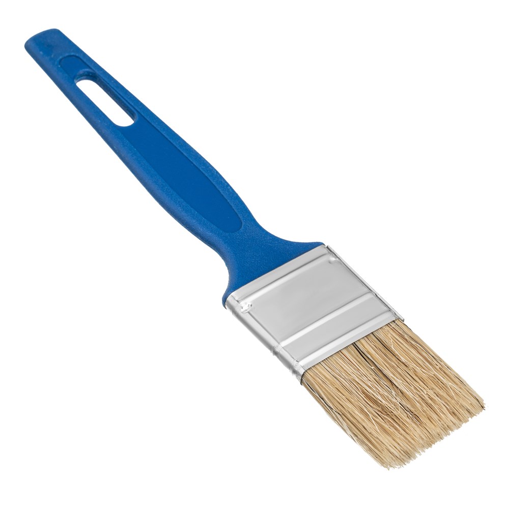 Кисть оснащена рабочей частью из натуральной свиной щетины с добавлением искусственных волокон, что делает ее устойчивой к истиранию и воздействиям растворителей. Пластиковая рукоятка обеспечивает удобный хват, а отверстие в ней позволяет организовать подвесное хранение.