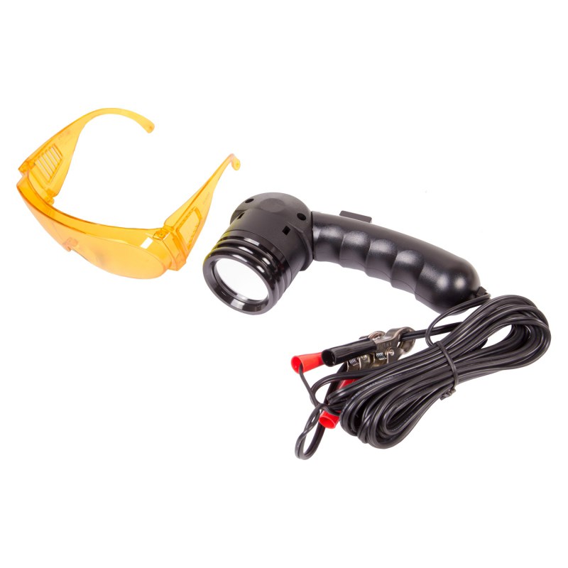 • Длинный 5 метровый провод ультрафиолетового фонарика с зажимными клеммами «крокодильчик» для подсоединения к автомобильному аккумулятору
