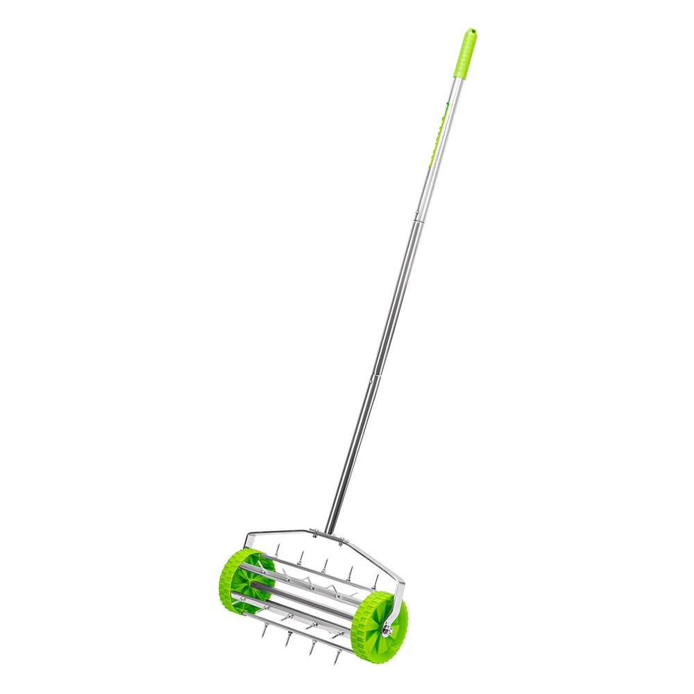- Удобство использования: Аэратор оснащен пластиковыми колесами для легкого перемещения по газону.