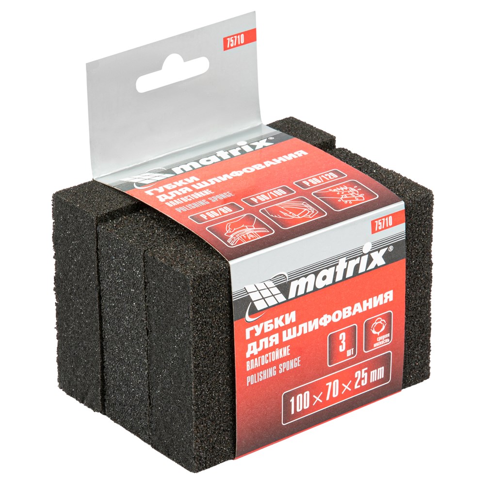 Губка для шлифования средней жесткости Matrix 75710 размером 100 х 70 х 25 мм предназначена для эффективного выполнения шлифовальных работ. В комплект входят три губки, каждая из которых покрыта абразивом с четырех сторон, при этом с двух сторон имеется различная зернистость: P 60/80, P 60/100 и P 80/120.
