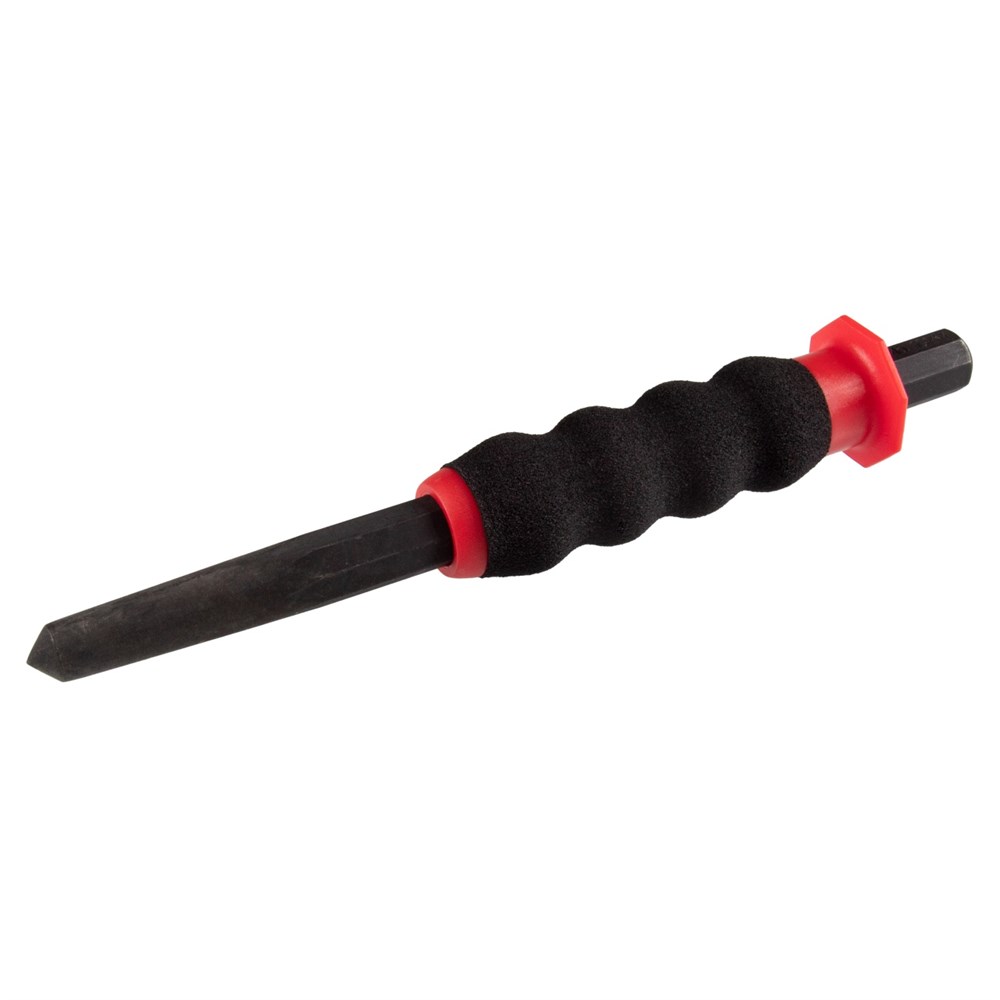 Ø бойка – 10 мм Стержень – 8-гранный, 12 мм Рабочая длина – 75 мм Общая длина – 185 мм Материалы – инструментальная сталь Cr-Mo, фосфатированное покрытие, PP+вспененный PU (защитная рукоять) Индивидуальная упаковка – пакет LDPE Размеры общие – 185×30×30 мм Вес – 0,180 кг