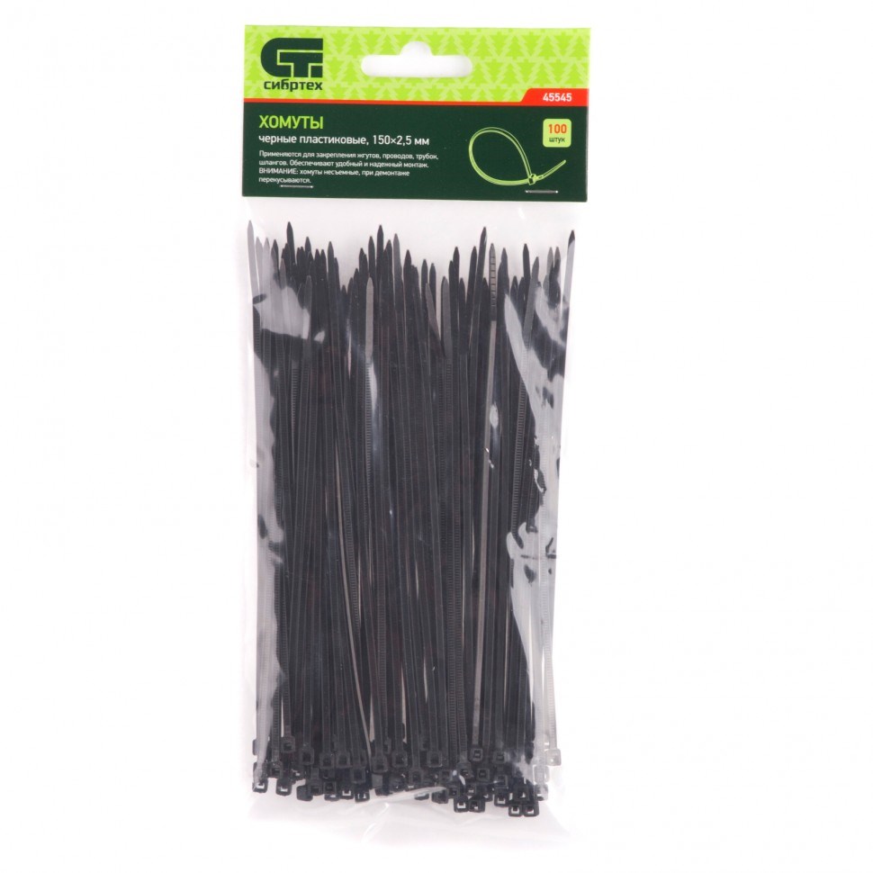 Представляем вам черные пластиковые хомуты Сибртех 45545, размером 150 х 2,5 мм. В каждой упаковке вы получите 100 штук, что делает этот товар идеальным для различных применений в быту и на производстве.