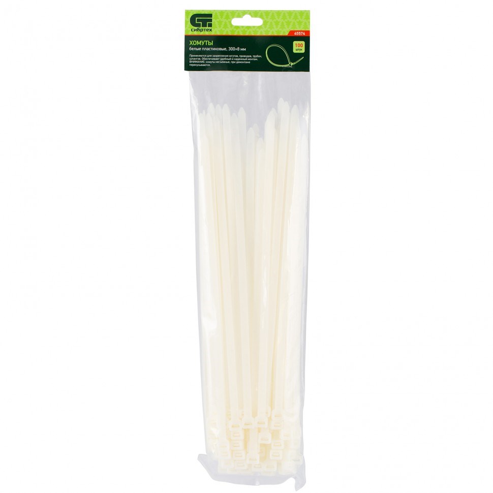 Хомуты, 300 х 8 мм, пластиковые, белые, 100 шт Сибртех 45574