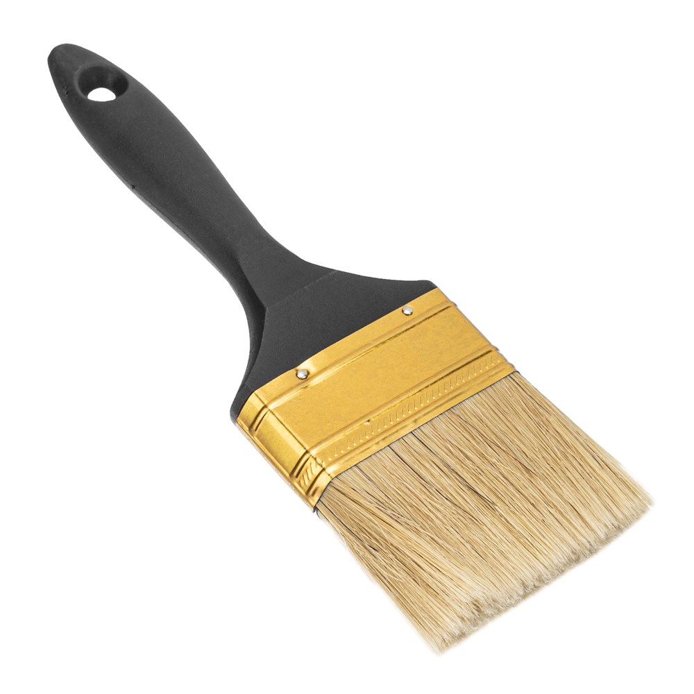 Кисть изготовлена из натуральной щетины с увеличенной плотностью набивки, что позволяет ей эффективно наносить различные типы лакокрасочных материалов, включая те, которые содержат растворители. Пластмассовая ручка обеспечивает удобный хват и комфорт в работе.