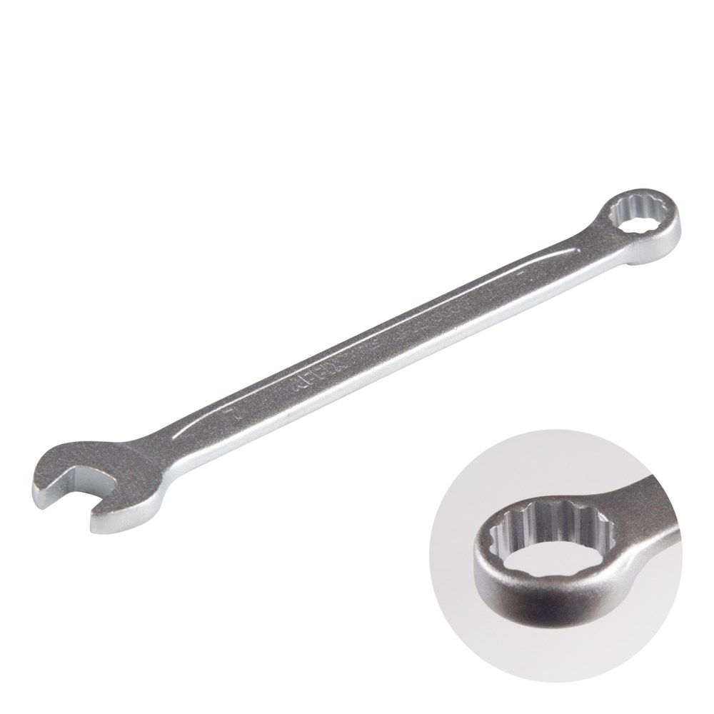 Размер 7 мм Рабочий профиль рожковый / накидной 12-гранный Материалы инструментальная сталь Cr-V, хром Размеры 111×17,5×5 мм Вес 0,022 кг