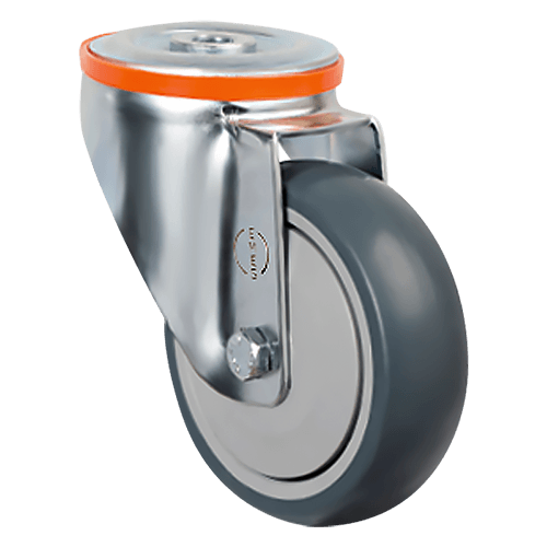 Колесо аппаратное EMES EM04 MBT 100 — это поворотное аппаратное колесо, предназначенное для маневренного перемещения оборудования. Оно оснащено шинкой из термопластичной серой резины, обод отлит из полипропилена и защищен пластиковым кожухом. Поворотный кронштейн изготовлен из оцинкованной стали, что обеспечивает прочность и защиту от коррозии. В оси установлен шариковый подшипник, а в поворотном узле — двойной шарикоподшипник для плавного и точного вращения.