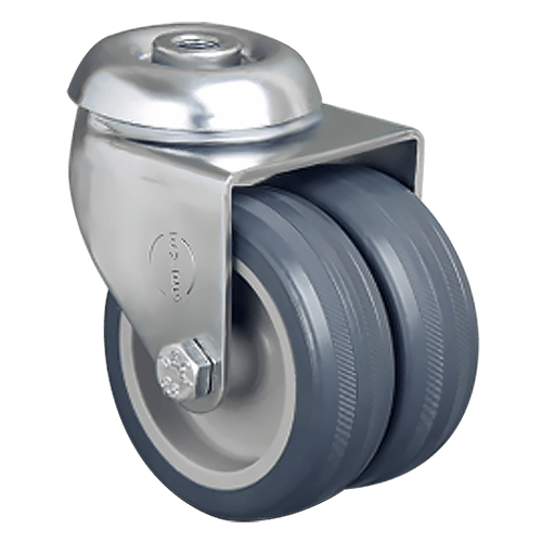 Колесо аппаратное EMES ET04 MKT 75 — поворотное аппаратное колесо, разработанное для эффективного и бесследного передвижения различного оборудования. Обод отлит из прочного полипропилена, шинка изготовлена из термопластичной резины, что обеспечивает бесшумное качение и защиту напольных покрытий. В оси установлен надежный подшипник скольжения, а в поворотном узле — двойной шарикоподшипник для плавного и легкого вращения. Поворотный кронштейн изготовлен из оцинкованной стали, что гарантирует устойчивость к коррозии. Особенностью модели является крепление под болт, позволяющее быстро и надежно зафиксировать колесо.