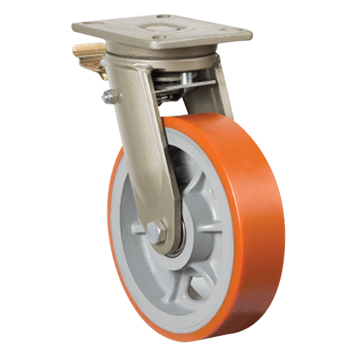 Колесо большегрузное полиуретановое EMES EV01 VBP 200F-50 — это поворотное колесо с платформенным креплением и встроенным тормозом, предназначенное для эксплуатации под высокими нагрузками. Контактный слой из полиуретана твердостью 95A по Шору обеспечивает высокую износостойкость и устойчивость к механическим повреждениям. Прочный чугунный обод и стальной сварной кронштейн усиливают конструкцию, делая её подходящей для самых тяжёлых условий. Установка шариковых подшипников в оси и поворотном механизме гарантирует плавное передвижение и точный контроль направления. Наличие тормоза позволяет надёжно фиксировать тележку или оборудование в нужном положении.