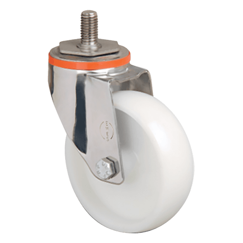 Колесо нейлоновое EMES EM05 ZKZ 80 (INOX) — поворотное колесо с креплением на один болт, оснащённое цельнолитым нейлоновым роликом. Поворотный кронштейн изготовлен из высококачественной нержавеющей стали. В конструкции предусмотрены: двойной шарикоподшипник в поворотном узле, пластиковый пыльник и подшипник скольжения в ступице. Обладает высокой износостойкостью и устойчивостью к большинству агрессивных химических сред.