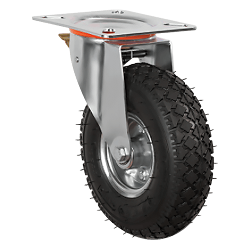 Колесо пневматическое EMES EG01 SBRh 260F — это поворотное пневматическое колесо с функцией ножного тормоза, предназначенное для эффективного управления передвижением тележек и другого оборудования. Конструкция включает обод из прессованной стали и контактный слой из чёрной износостойкой резины. В ступице установлен надёжный шариковый подшипник для плавного хода. Поворотной механизм размещён в кронштейне из оцинкованной стали, оснащён двойным шарикоподшипником с защитой от загрязнений пластиковыми пыльниками. Крепление осуществляется через платформу с 4 отверстиями и регулируемыми гайками, что обеспечивает удобство установки и настройки.