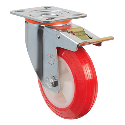 Колесо полиуретановое EMES EM01 ZKP 125 F — поворотное колесо с тормозом, предназначенное для точного контроля передвижения оборудования. Изготовлено с применением высококачественных материалов: обод — из полиамида, шинка — из термопластичного полиуретана (95 Шор А), отличающегося высокой прочностью и устойчивостью к агрессивным химическим веществам. Ось оснащена подшипником скольжения, а поворотный узел — двойным шарикоподшипником для плавного и надежного вращения. Поворотный кронштейн выполнен из оцинкованной стали, что обеспечивает защиту от коррозии, и дополнен тормозом для фиксации положения колеса.