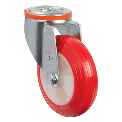 Колесо полиуретановое EMES EM04 ZKP 125 — поворотное колесо, обеспечивающее высокую маневренность и надежность при передвижении оборудования. Обод изготовлен из прочного полиамида, а шинка — из термопластичного полиуретана (95 Шор А), обладающего высокой устойчивостью к износу и воздействию агрессивных химических веществ. В оси установлен подшипник скольжения, а в поворотном узле — двойной шарикоподшипник, обеспечивающий плавное и долговечное вращение. Поворотный кронштейн выполнен из оцинкованной стали и оснащен креплением под болт.