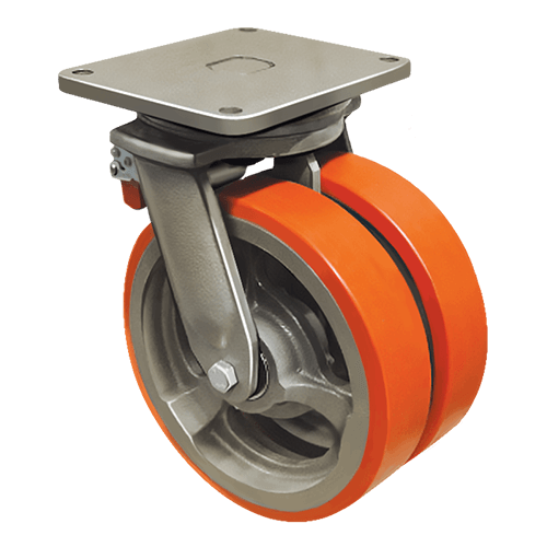 Колесо сдвоенное большегрузное EMES EW01 VBP 350 F — это сдвоенное колесо с высокой грузоподъёмностью, оснащённое шинкой из прочного полиуретана. Обод отлит из чугуна, что обеспечивает надёжность и износостойкость. В ступице установлены качественные шариковые подшипники для плавного и бесперебойного хода. Особенностью модели является поворотный кронштейн из стали, оснащённый тормозом, который позволяет фиксировать положение колеса при необходимости. Опорно-поворотный подшипник в поворотном механизме обеспечивает лёгкость и точность вращения. Крепление осуществляется по платформенному типу с помощью болта и регулируемой гайки.