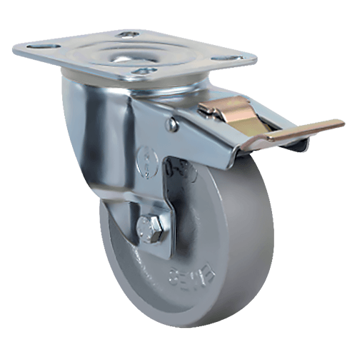 Колесо термостойкое EMES EM01 VKV 80 F — это поворотное колесо с тормозом, специально разработанное для эксплуатации в условиях высоких температур. Оснащено цельнолитым чугунным колесом, которое выдерживает температуры от -40°C до +300°C. В оси установлен подшипник скольжения, а в поворотном механизме — двухрядный шарикоподшипник с термостойкой смазкой. Кронштейн изготовлен из высококачественной стали с двойной оцинковкой и оснащен тормозным механизмом. Крепление осуществляется через опорную платформу.