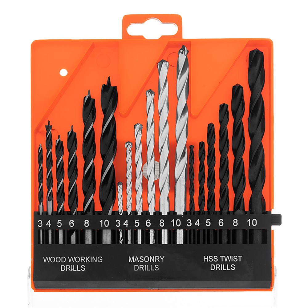 - Комплектация: 6 сверл по бетону (3, 4, 5, 6, 8, 10 мм), 6 сверл по металлу (3, 4, 5, 6, 8, 10 мм), 6 сверл по дереву (3, 4, 5, 6, 8, 10 мм), пластиковый кейс.