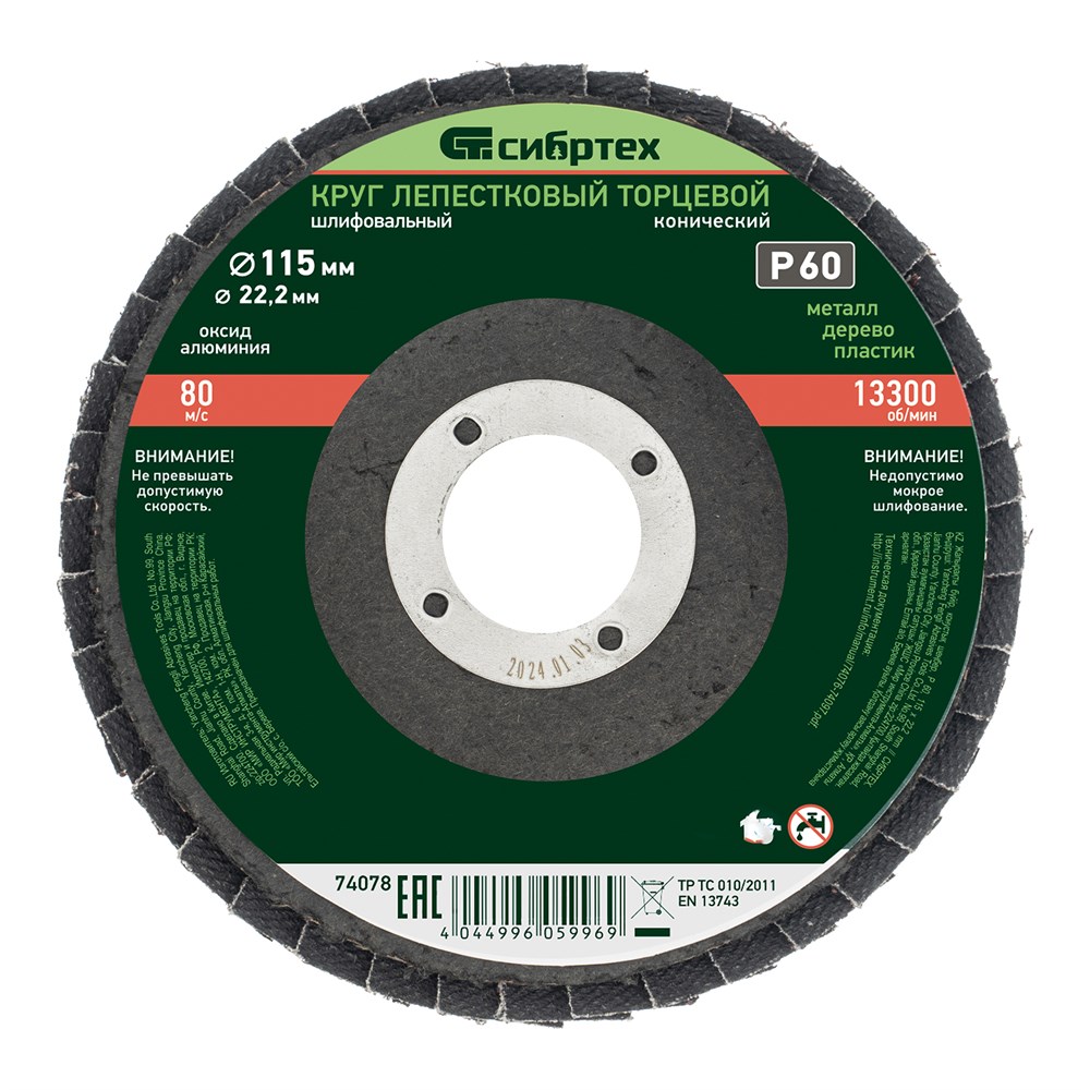 Круг лепестковый торцевой, конический, Р 60,115 х 22.2 мм Сибртех 74078