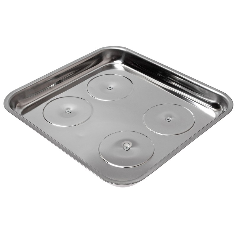 Применяется для сбора мелкого крепежа и деталей при ремонтных работах, а также для хранения. При помощи 4-х мощных магнитов поддон надёжно устанавливается на любую железную поверхность под любым углом, в зависимости от места ремонта.