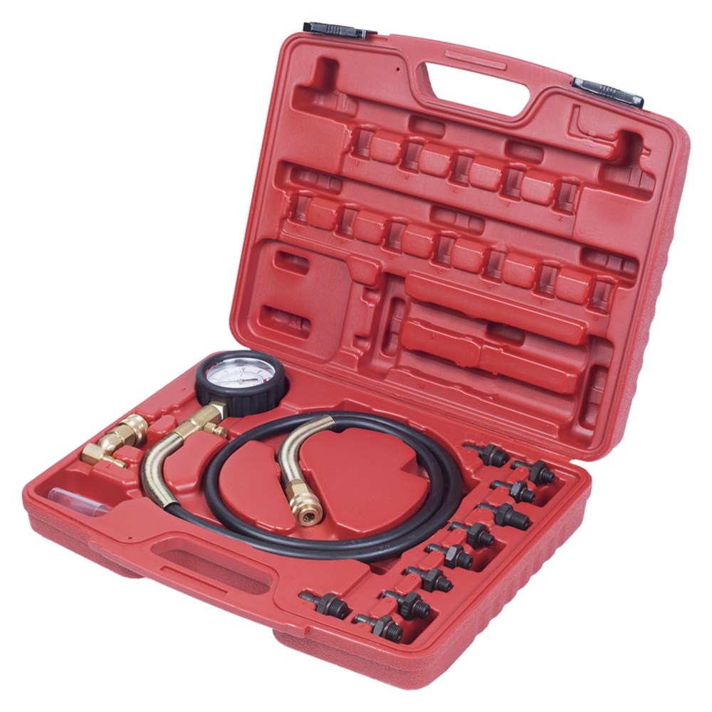 Назначение Тестирование работы масляного насоса: проверка давления масла в двигателе автомобиля. Комплектация и характеристики • Манометр диаметр 83 мм: диапазон измеряемой компрессии: 0-10 бар • Устройство с клапаном фиксации измеряемой компрессии и кнопкой сброса • Гибкий резиновый шланг 1300 мм с быстросъёмным соединением • Адаптеры: 1/8х28PT, 1/8х27NPT, 1/4х18NPT, 3/8x20UNF, 1/2x20UNF, M10x1.0, M12x1.5, M14x1.5, M16x1.5, M18x1.5 • Адаптер угловой • Комплект запасных прокладок • Кейс Применение по маркам: Audi, BMW, Citroen, Diahatsu, Fiat, Ford, Honda, Hundai, Isuzu, Jaguar, Lada, Lancia, Mazda, Mercedes, Mitsubishi, Nissan, Opel, Peugeot, Renault, Rover, Saab, Skoda, Subaru, Suzuki, Toyota, VWи др. Технические характеристики Габариты: 370х310х90 мм Вес: 1,833 кг