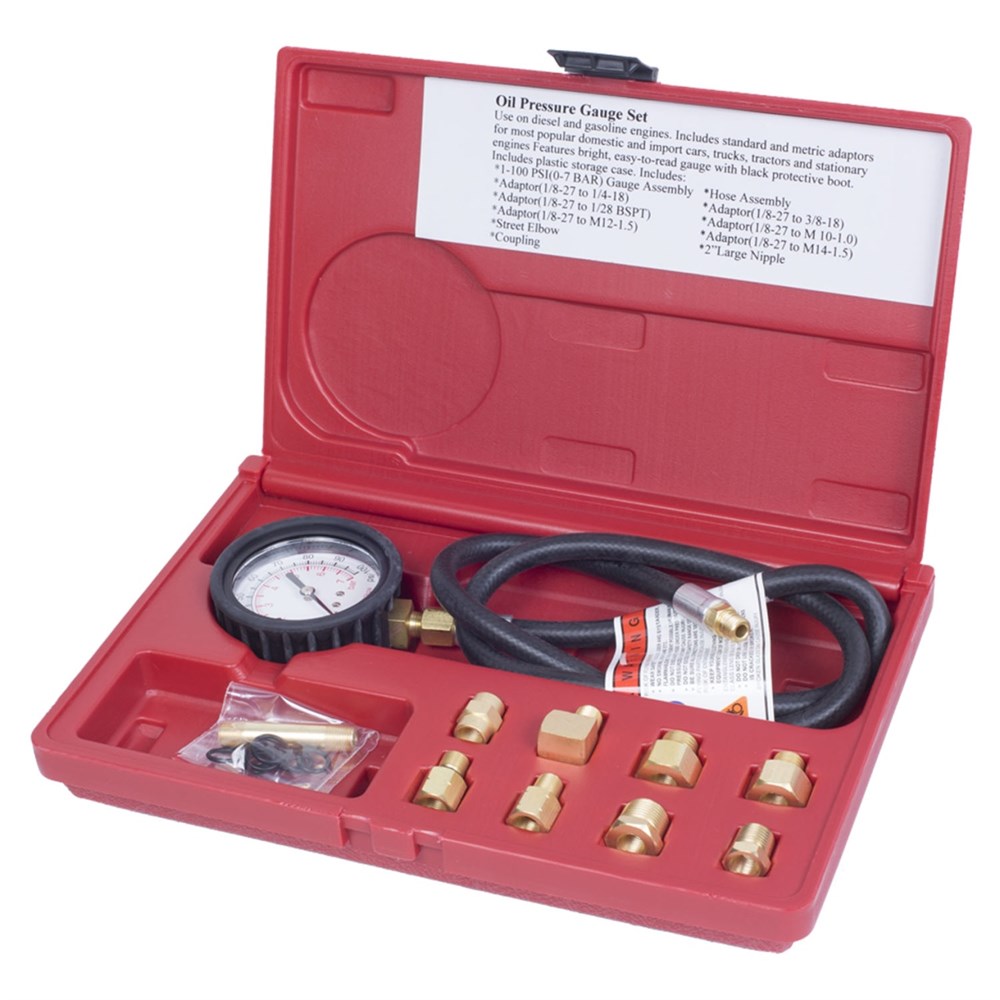 Манометр предназначен для тестирования давления масла в двигателях. Подходит как к бензиновым, так и к дизельным двигателям легковых, грузовых автомобилей и тракторов. Внимание! При работающем двигателе давление масла имеет большую величину! Будьте внимательны и осторожны! Состав набора и характеристики • Манометр с гибким шлангом, защитный кожух, d=63 мм шкала 0-7 атм. длина шланга 900 мм • Адаптер №1 1/8х27 – 1/4х18 • Адаптер №2 1/8х27 – 3/8х18 • Адаптер №3 1/8х27 – 1/28 (коническая резьба) • Адаптер №4 1/8х27 – M10х1.0 • Адаптер №5 1/8х27 – M12х1.5 • Адаптер №6 1/8х27 – M14х1.5 • Адаптер №7 1/8х27 – 1/8х27 • Адаптер №8 ниппель 50 мм 1/8х27 – 1/8х27 • Адаптер №9 угловой 900 • Комплект резиновых прокладок • Пластиковый кейс