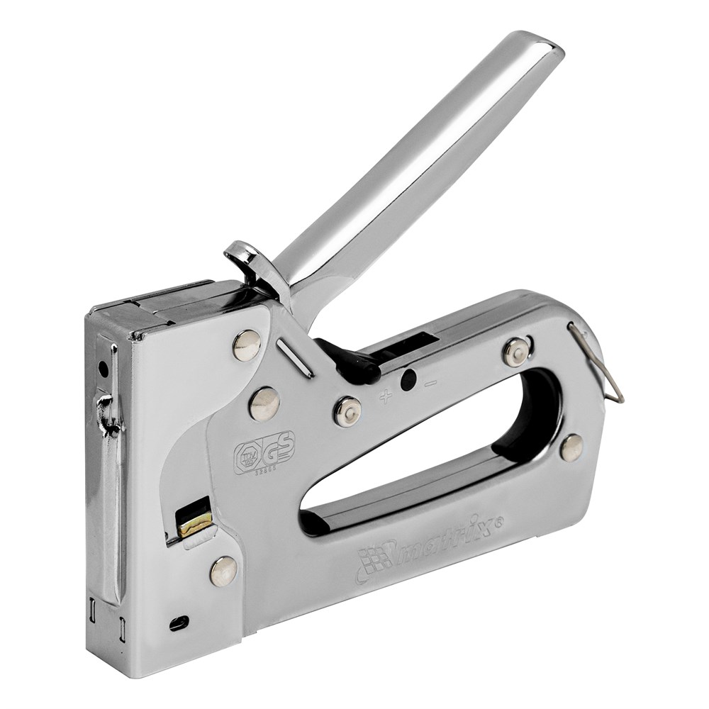 - Безопасное хранение: Скоба-фиксатор удерживает рукоятку в нерабочем положении, исключая случайное срабатывание степлера.