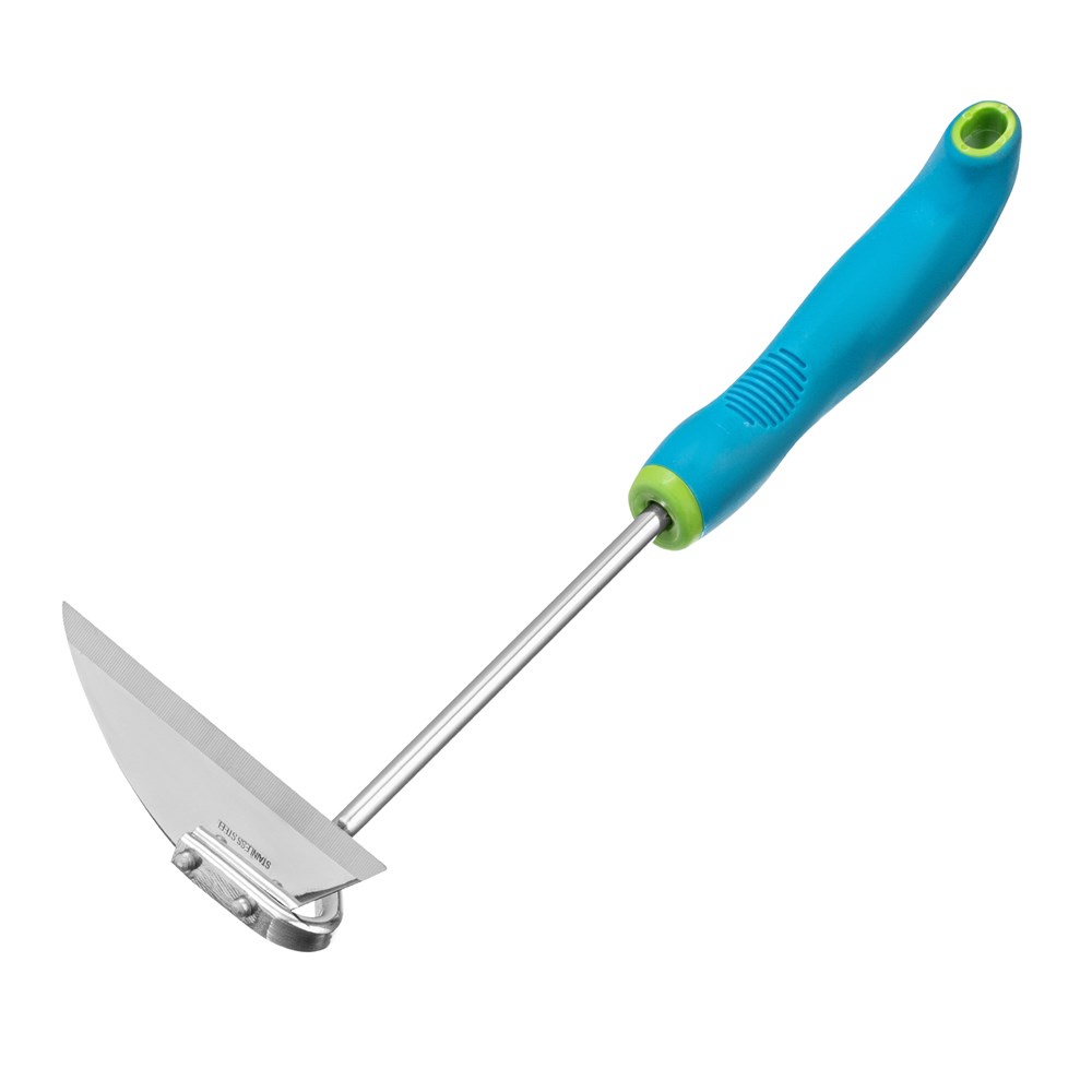 Мотыжка оснащена двухкомпонентной рукояткой, что обеспечивает комфорт и надежность в использовании. Острая рабочая кромка позволяет эффективно удалять сорняки и нарезать лунки для посадки семян. Компактные размеры инструмента делают его идеальным для работы в ограниченном пространстве.