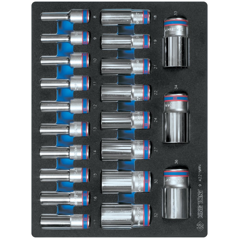 Набор глубоких торцевых головок 1/2", двенадцатигранные, 8-36 мм, ложемент, 21 предмет KING TONY 9-4221MRV TONY