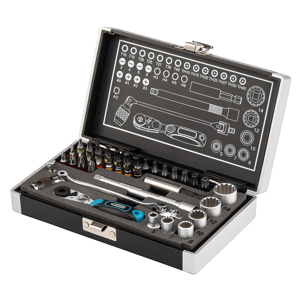 - 37 предметов: трещотка, адаптер, карданный ключ, торцевые головки и биты с хвостовиком 1/4 дюйма.