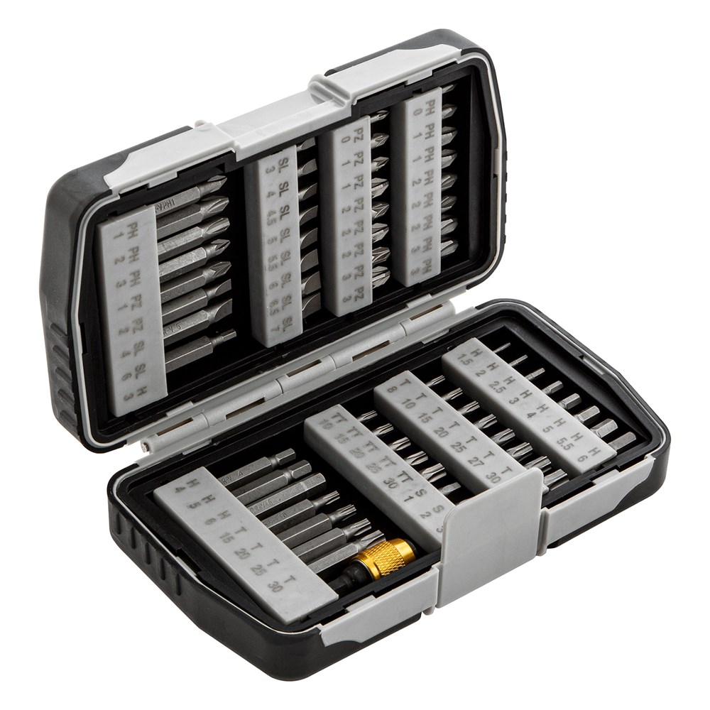 КомплектацияКейс - 1 штБиты 25 мм: РН0, РН1 - 2 штРН2 - 3 штРН3 - 2 штPZ0, PZ1 - 2 штPZ2 - 3 штPZ3 - 2 штSL3, SL4, SL4.5, SL5, SL5.5, SL6, H1.5, H2, H2.5, H3, H4, H5, H5.5, H6, T8, T10, T15, T20, T25, T27, T30, T40, TT10, TT15, TT20, TT25, TT27, TT30, Sq1, Sq2, Sq3 -
