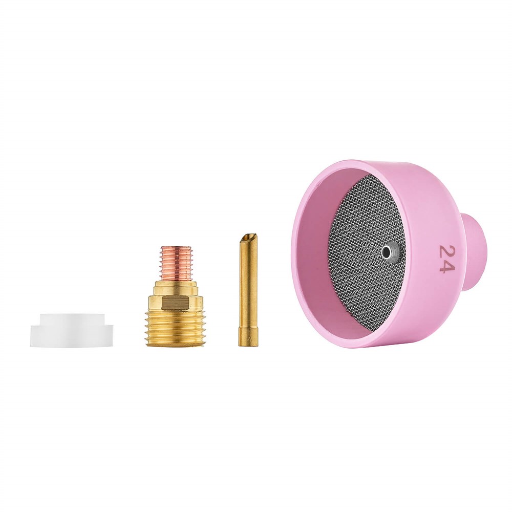 Основная особенность набора CLS0937 заключается в керамическом сопле с встроенной газовой сеткой. Внутренний диаметр чашки составляет 38 мм, а сопло с сеткой в сочетании с газовой линзой создает равномерный ламинарный поток. Это позволяет распределять выходящий газ по всей окружности сопла и обеспечивает высокий уровень защиты сварочной ванны.