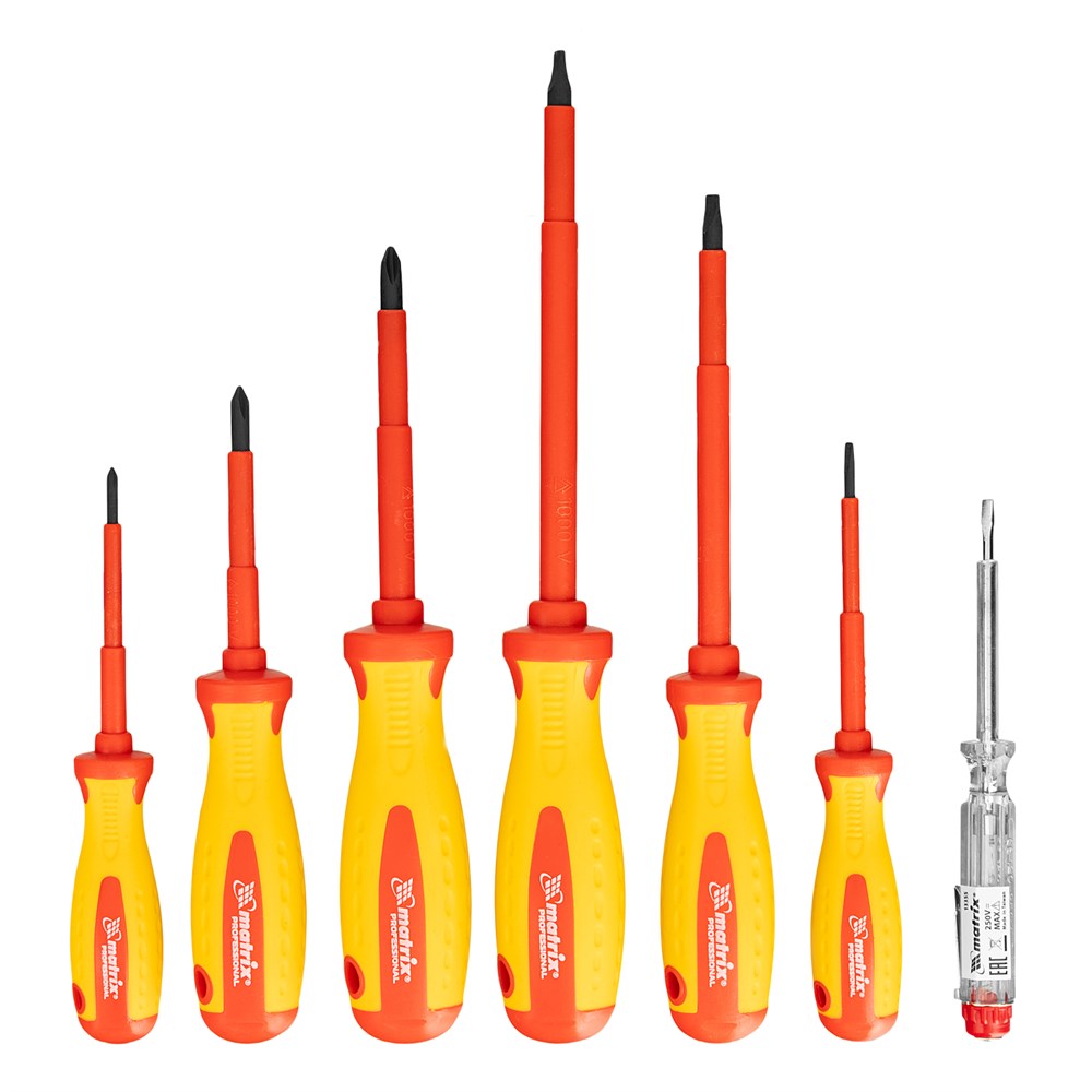 Набор диэлектрических отверток 7 шт, до 1000 В, пробник электрический до 250 В, двухкомпонентные рукоятки Matrix Professional 13355