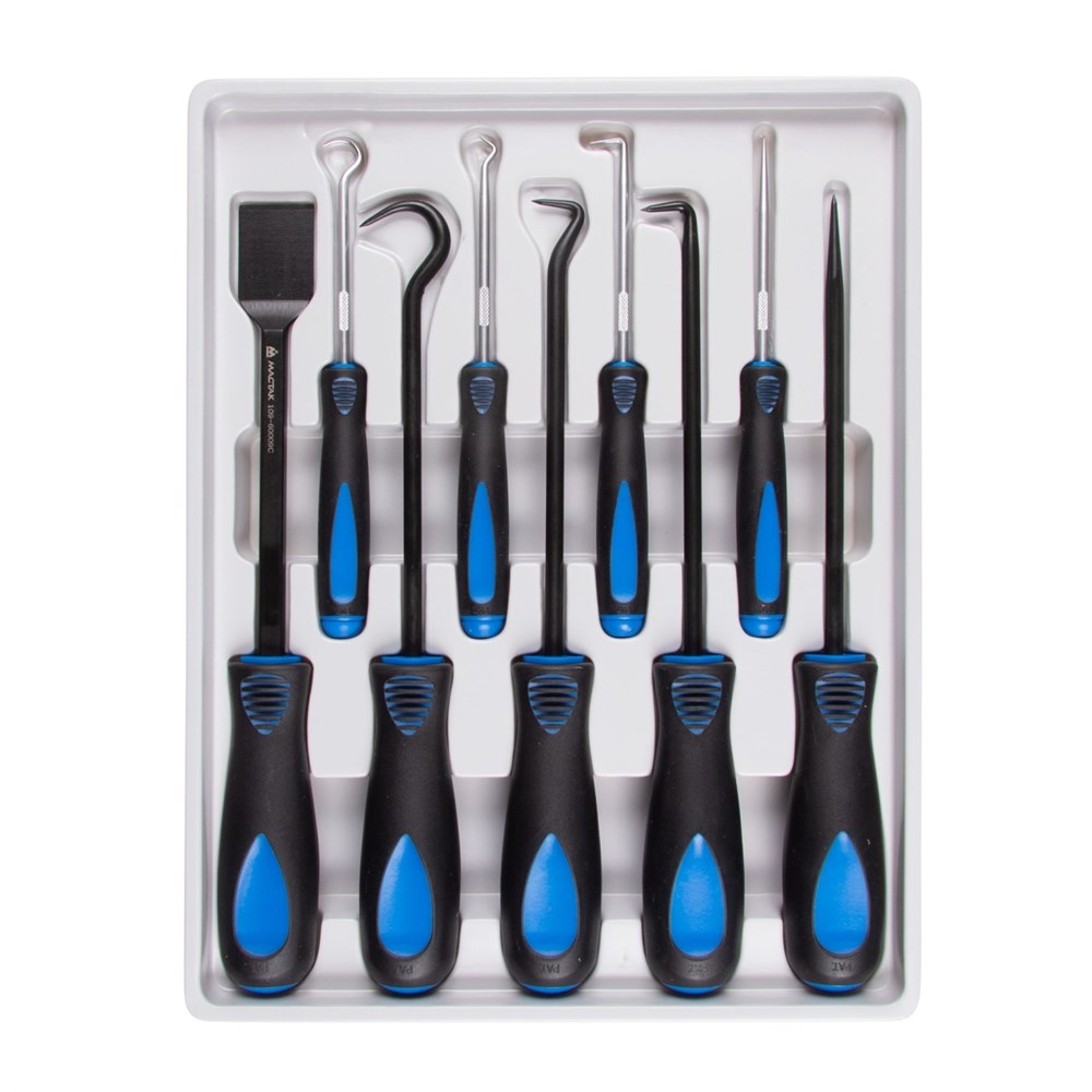 В комплекте специальные насадки-крючки разной формы, которые помогут быстро и безопасно извлечь уплотнительные кольца и сальники, отлично подойдут для разделения проводов, извлечения мелких деталей, гаек или шайб из труднодоступных мест, разметочных работ. Инструменты изготовлены из нержавеющей хирургической стали.