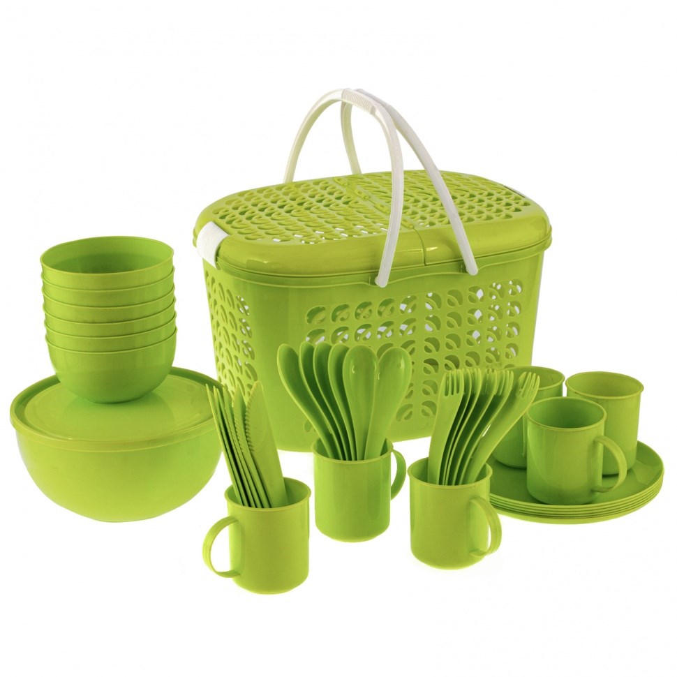 - Оптимальная комплектация. Набор включает все необходимое для комфортного отдыха: тарелки, стаканы, миски, столовые приборы, большой салатник с крышкой и удобную корзину для переноски.