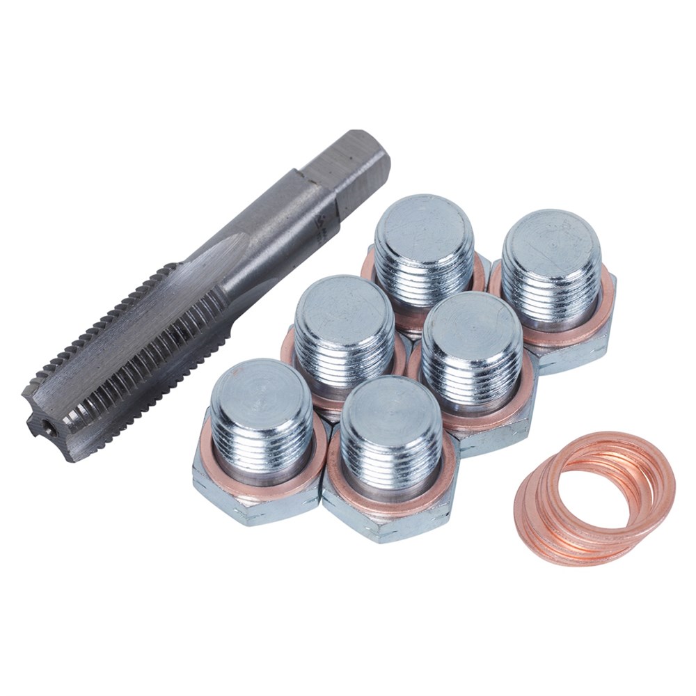 Назначение Восстановление поврежденной или сорванной резьбы маслосливных отверстий. Комплектация – Метчик M15×1.5 – Маслосливные пробки 6 шт. – Шайбы алюминиевые 12 шт. – Пластиковый бокс Рекомендованный Ø сверла – 13,5 мм (в комплект не входит). Материалы • Метчик – сталь инструментальная легированная, марка (аналоги): Сталь ХВГ (страны СНГ, ГОСТ 5950-2000), SKS3 (Япония, стандарт JIS), 105WCr6 (Германия, стандарт DIN), T31507 (стандарт США) • Пробки винтовые – сталь конструкционная, углеродистая - марка (аналоги): Сталь 15 (страны СНГ, ГОСТ), S15 (Япония, стандарт JIS), С15/Ск 15 (Германия, DIN), 1015 (стандарт США, ASTM) Технические характеристики Материалы – быстрорежущая сталь, конструкционная сталь, цинк, медь (шайбы), ПВХ+акрил (бокс) Размеры бокса – 105×95×35 мм Вес – 0,324 кг