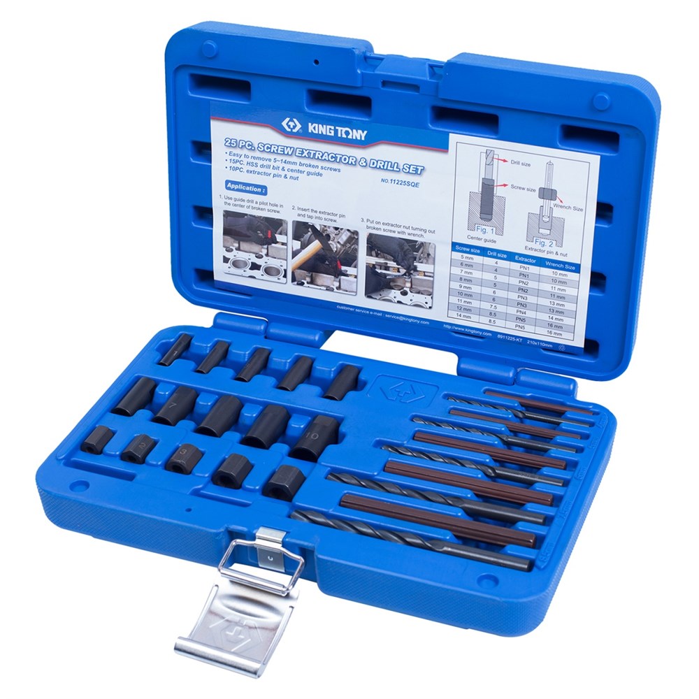 Набор экстракторов и свёрел, 25 предметов KING TONY 11225SQ. Набор предназначен для демонтажа обломаных шпилек или болтов. Позволяет аккуратно извлечь остаток шпильки или болта, не повреждая конструкцию основы. Комплектация набора включает свёрла и экстракторы для извлечения обломанных шпилек: высверливается отверстие и с помощью соответствующего экстрактора извлекается остаток. Для того, чтобы точно по центру высверлить отверстие в шпильке, в наборе присутствуют специальные центрирующие муфты. Набор позволяет работать с крепежом от 4 до 14 мм. Что входит в состав набора Свёрла – 5 шт Экстракторы – 5 шт Муфты экстракторов – 5 шт Центрирующие муфты – 10 шт Пластиковый кейс – 1 шт Перед началом работы внимательно ознакомьтесь с инструкцией по эксплуатаци. KINGTONY – наслаждайся своей работой!Характеристики