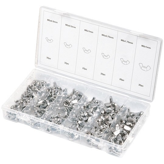 Набор гаек: М5 х 0.5, М5 х 0.8, М6 х 0.75, М6 х 1, М8 х 1, М8 х 1.75 мм, с "барашком", 150 предметов Сибртех 47606