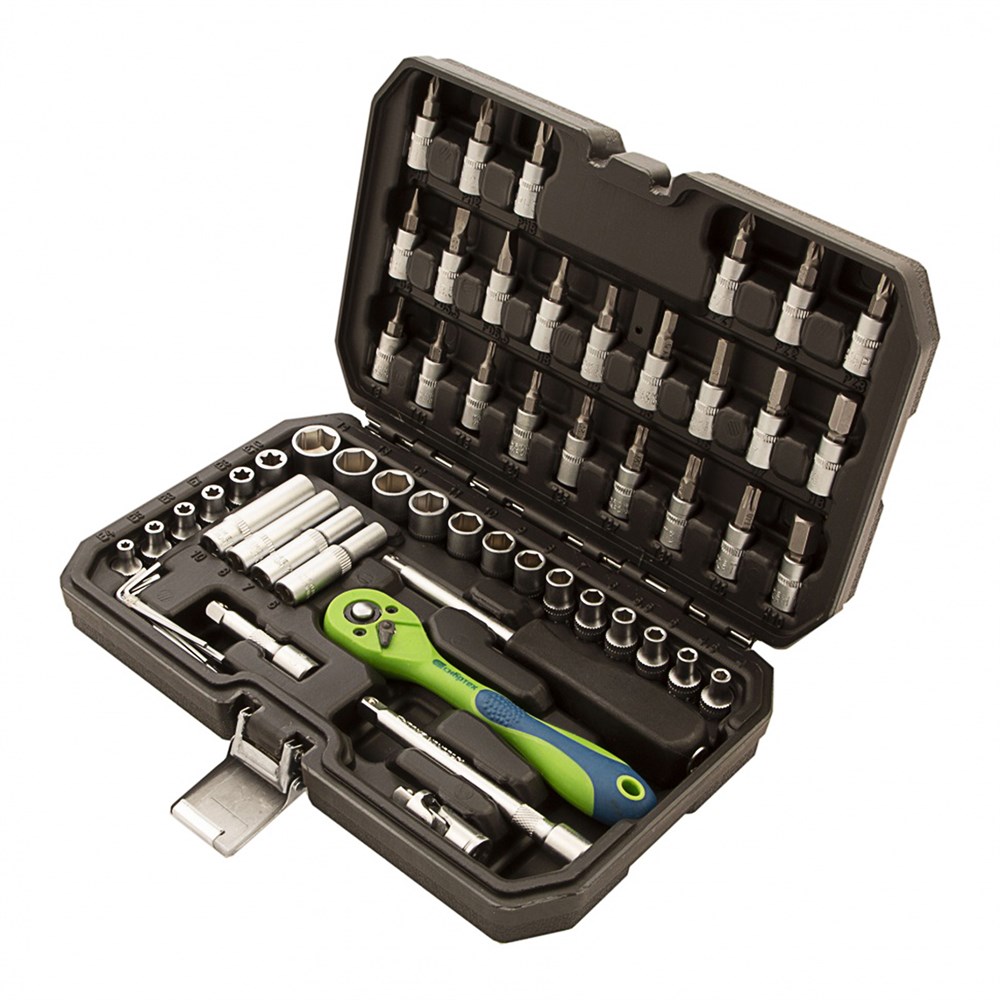 Этот набор состоит из 56 предметов, изготовленных из высококачественной стали CrV-группы. Комплектуется пластиковым кейсом, что обеспечивает компактность и легкость в транспортировке. Удобные удлинители и кардан в комплекте делают работу в труднодоступных местах гораздо проще.