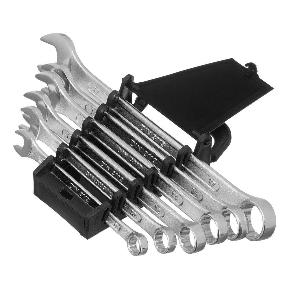 В состав набора входят 6 ключей из высококачественной хромованадиевой стали (CrV), предназначенных для работы с резьбовыми крепежами диаметром от 8 до 17 мм. Каждый ключ оборудован как рожковым, так и 12-гранным кольцевым зевом, что обеспечивает надежное сцепление с гайками и болтами, минимизируя риск их деформации.