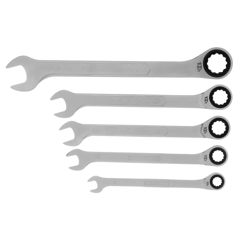 Набор ключей комбинированных трещоточных, количество зубьев 100, СRV, 5 шт, 8- 17 мм Gross 14858