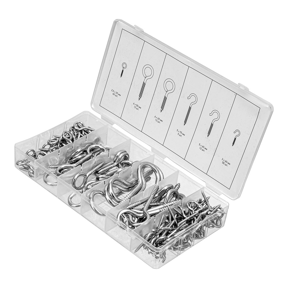 Набор крюков-саморезов 2.5 х 25, 3 х 40.5 х 65.5 х 75, 6 х 45, 6 х 50 мм, 151 предмет Сибртех 47611