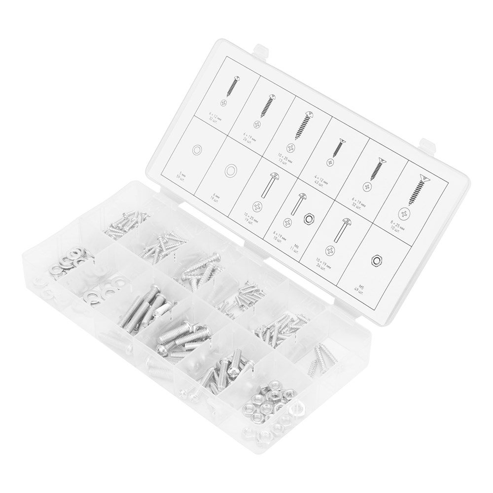 КомплектацияПластиковый кейс - 1 штСаморезы по дереву: 4х12 мм - 43 шт6х19 мм - 32 шт8х25 мм - 10 штСаморезы по металлу: 6х12 мм - 32 шт6х19 мм - 26 шт10х25 мм - 13 штВинты: 6х19 мм - 10 шт10х19 мм - 24 шт10х25 мм - 19 штШайбы: 5 мм - 59 шт6