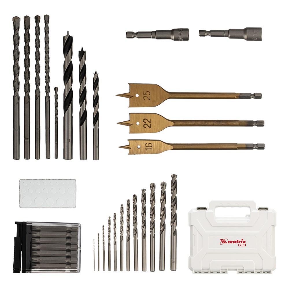 Набор сверл комбинированный, сверла по металлу 1-6.5 мм, бетону 4-8 мм, дереву 4-10 мм, перовые 16,22,25 мм, биты 20 шт, адаптер, головки 2 шт, зенковка, 50 предметов Pro Matrix 725650