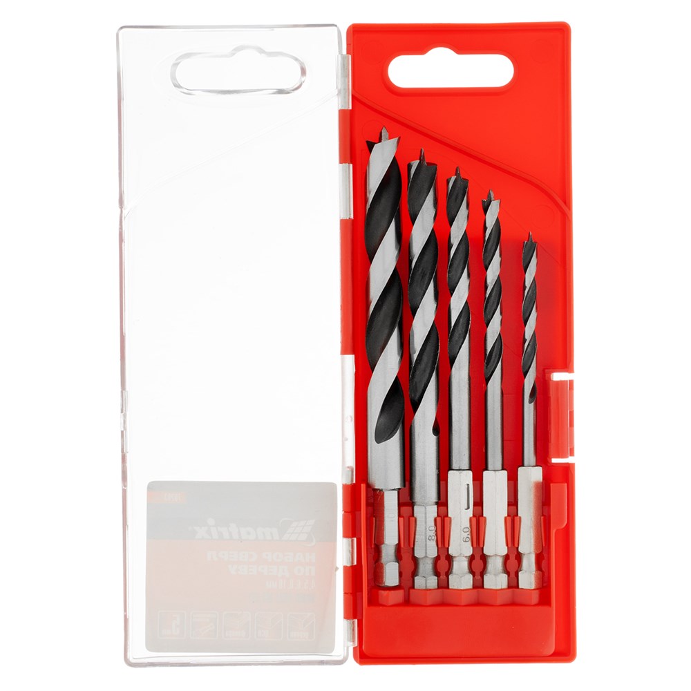 Набор сверл по дереву, 4-5-6-8-10 мм, 5 шт, шестигранный хвостовик, пластиковый кейс, Matrix 70283