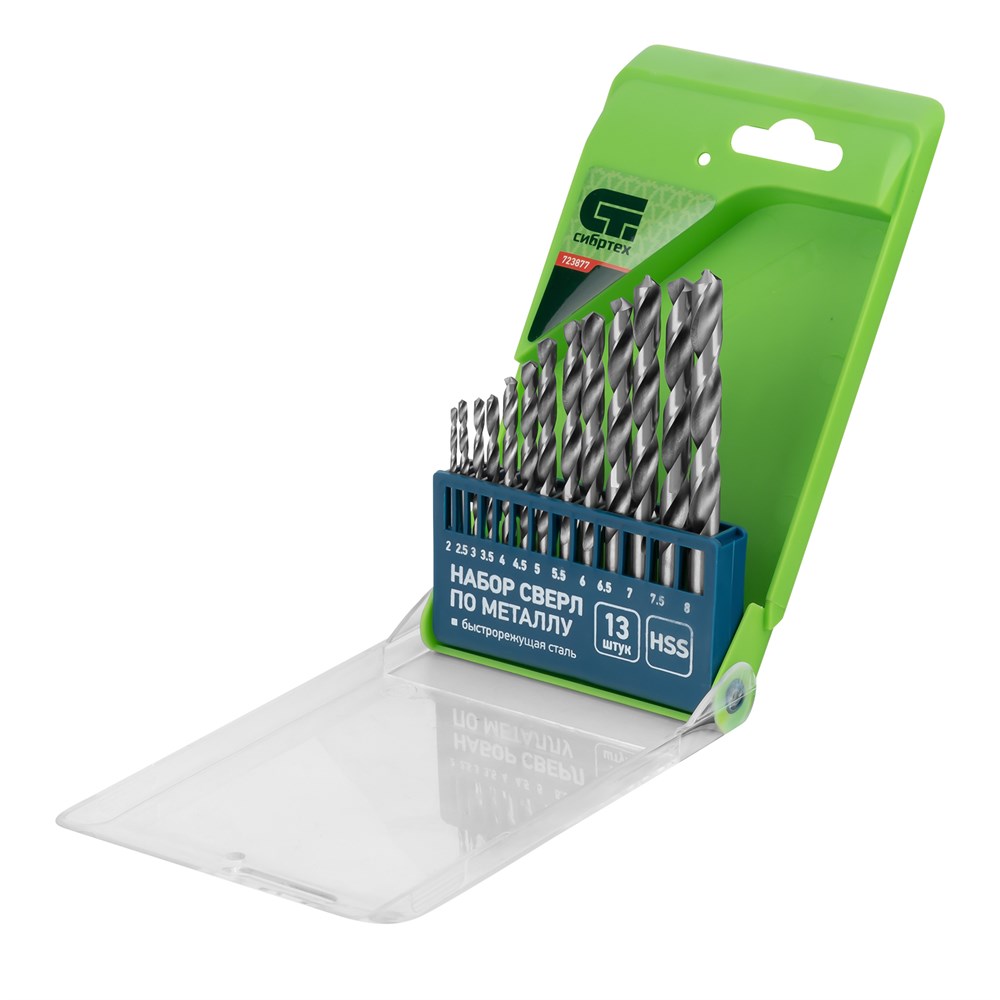 Набор сверл по металлу, 2-8 мм, (через 0.5 мм) HSS 13 шт, пластиковая коробка, цилиндрический хвостовик Сибртех 723877