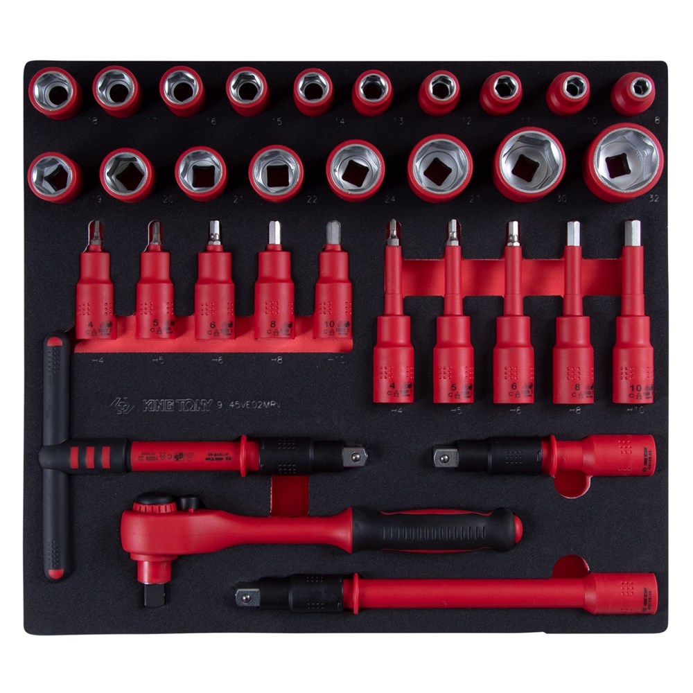 Материалы – инструментальные стали Cr-V, SNCM+V (S2), конструкционная сталь, хром, PP (изоляция), PP+TPR (рукоять трещотки), EVA (ложемент)