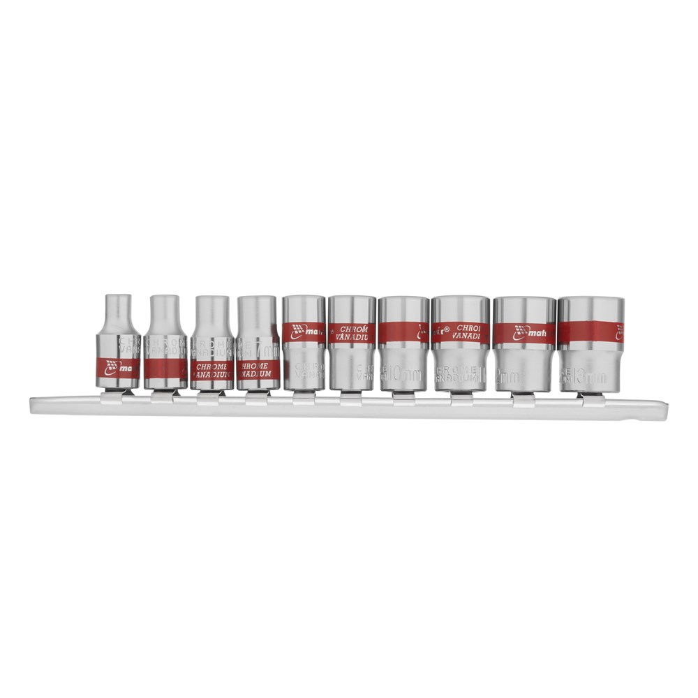 Набор состоит из 10 торцевых головок, изготовленных из прочной хромованадиевой стали (CrV), что обеспечивает долговечность и устойчивость к повышенным нагрузкам. Каждая головка имеет посадочное гнездо размером 1/4" и шестигранный профиль, что делает их идеальными для работы с резьбовыми соединениями.